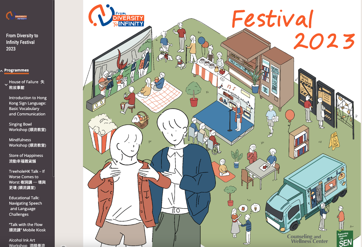 The festival, titled "From Diversity to infinity" is founded on our unwavering belief in the inherent value and unique abilities of every individual. By embracing, acknowledging, comprehending and supporting diverse abilities, irrespective of one's background or limitations (whether apparent or hidden), we can unleash their boundless potential. Our primary objective is to offer HKUSTers a transformative experience encompassing a wide array of exhibitions, enjoyable events, immersive workshops, and enlightening talks.