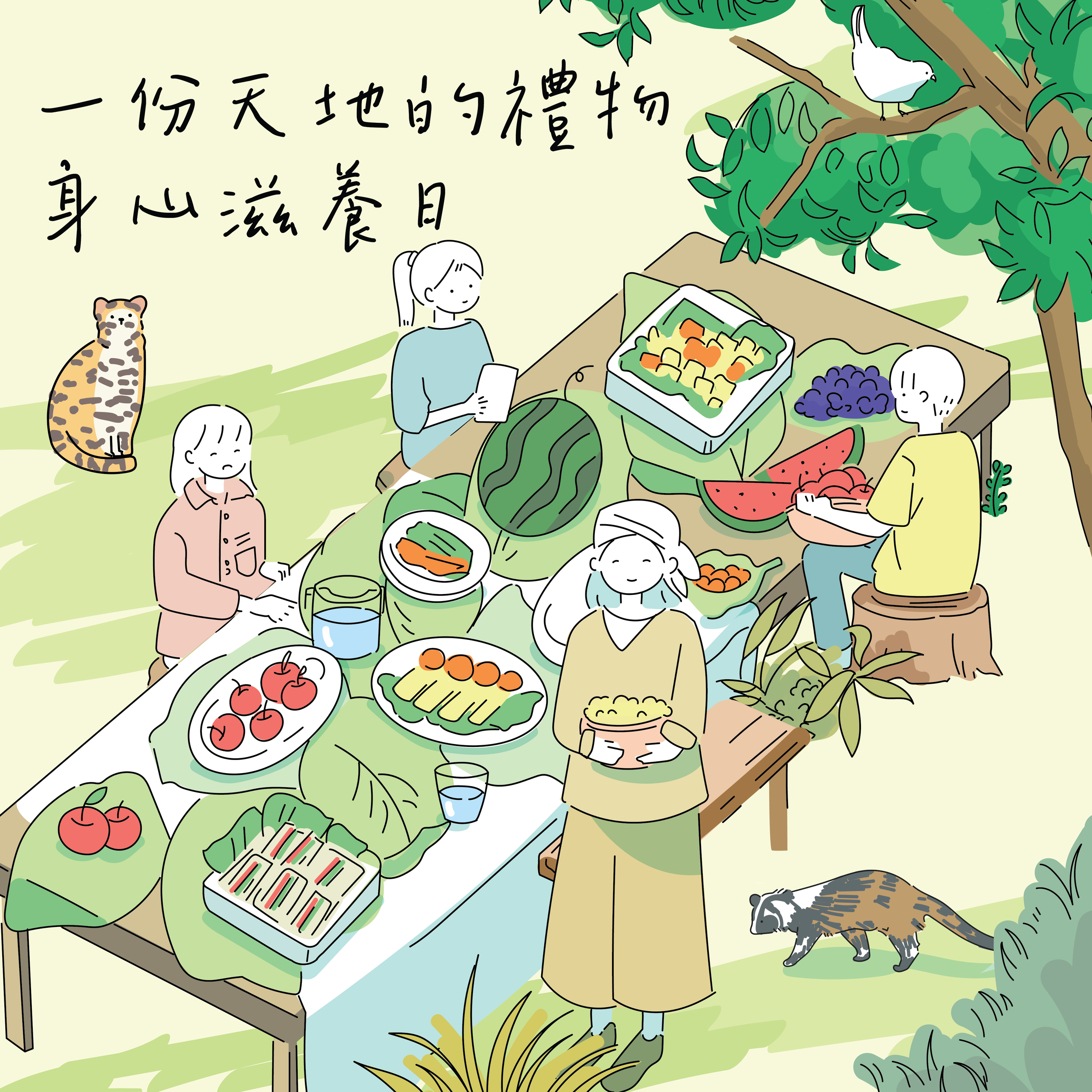 種子由土地當中破土而出,蘊含著滿滿的生命力;成長的過程中,陽光、空氣、水的滋養,缺一不可;重新觀看眼前的食物,我們看見萬物共生的交織與共存;酸甜苦辣、七彩繽紛,正正的生命的模樣。